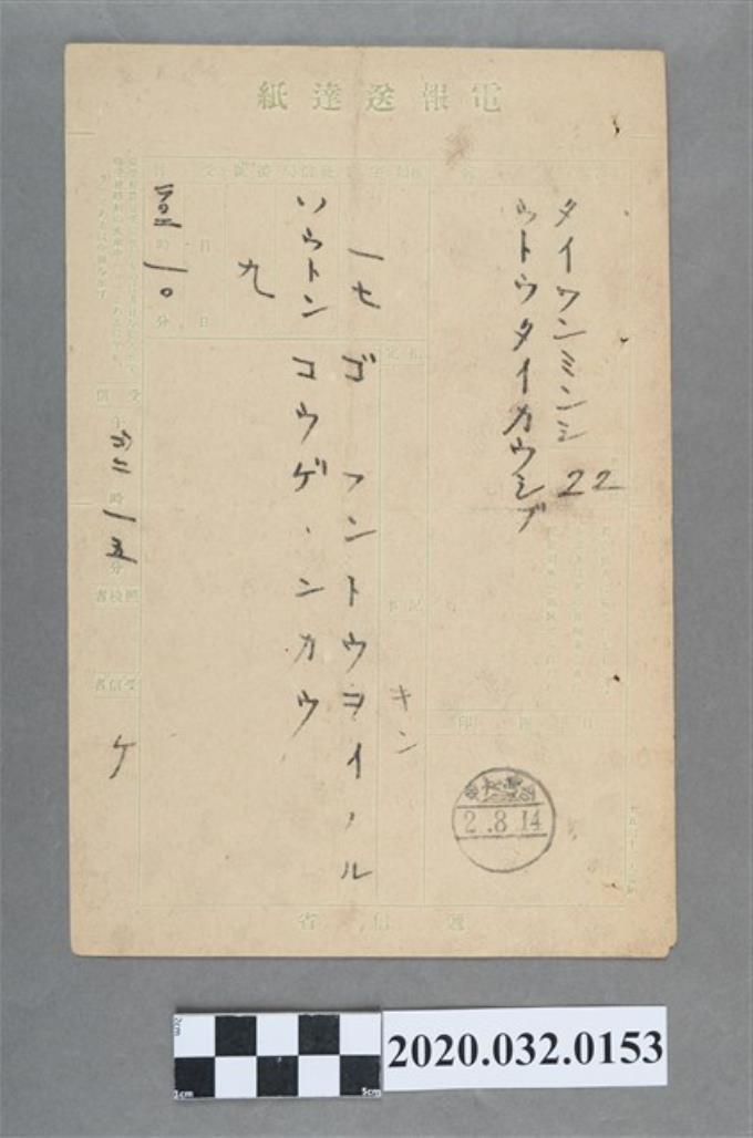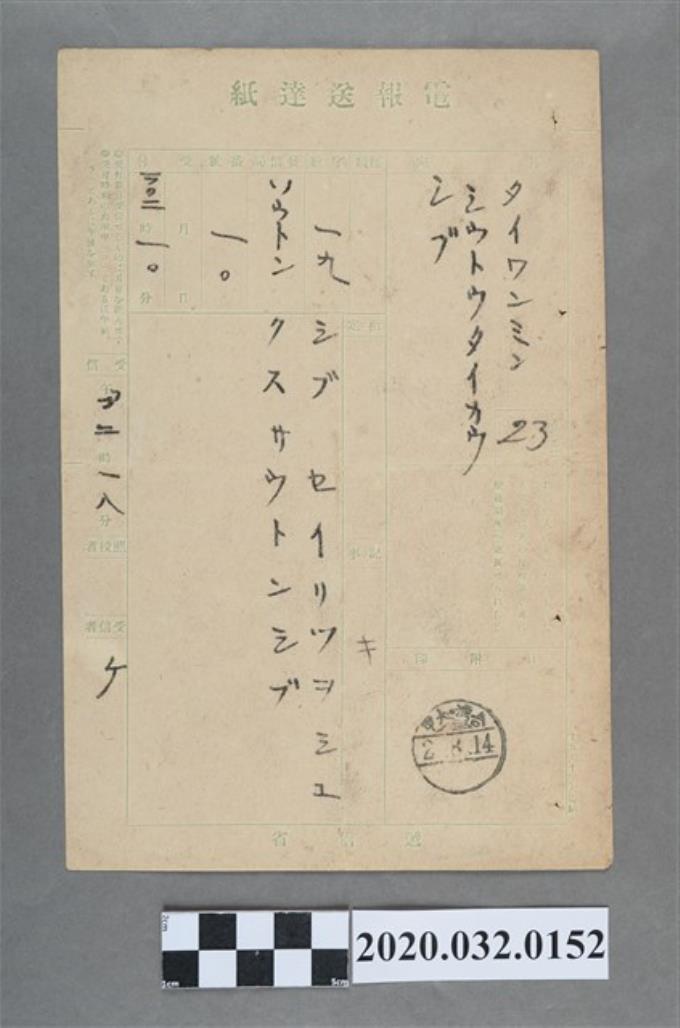 草屯支部主幹洪元煌賀大甲支部成立電報送達紙