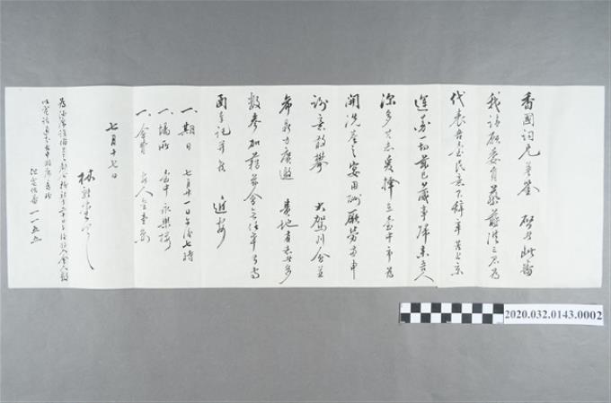 林獻堂邀杜香國參加加第五次議會請願委員蔡培火、蔣渭水、陳逢元洗塵宴墨寶