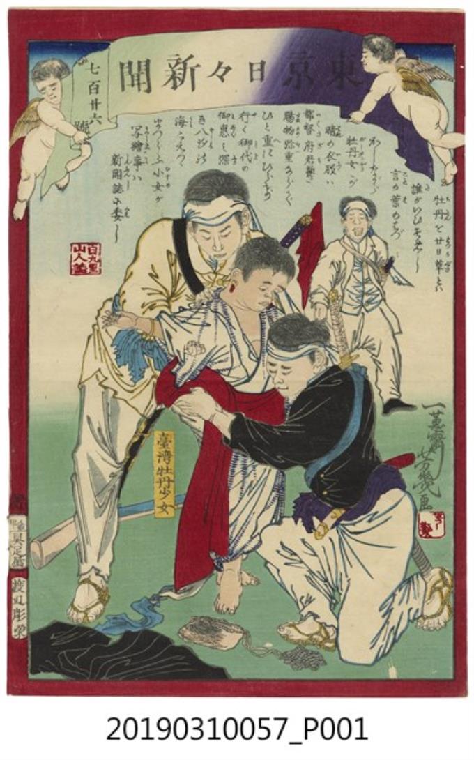 東京日日新聞七百廿六號〈擄獲牡丹鄉少女幫她換上和服〉版畫