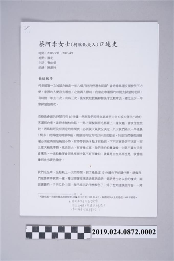 曹欽榮訪談柯蔡阿李女士口述歷史初稿之內容
