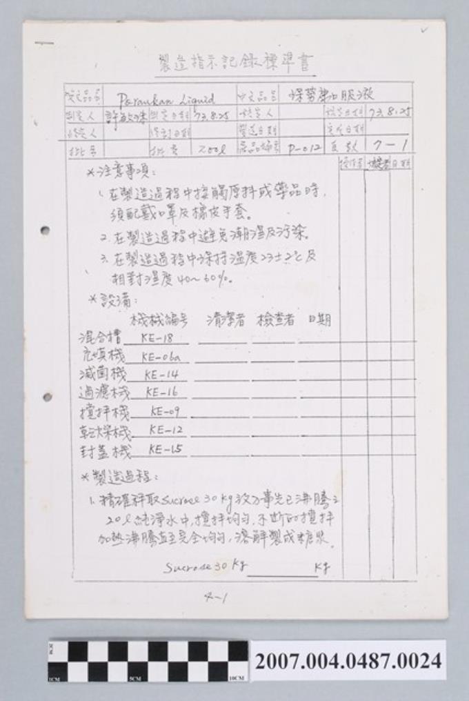 三和感嗽安糖漿製造指示記錄標準書
