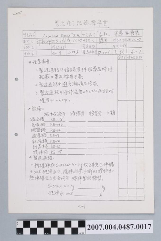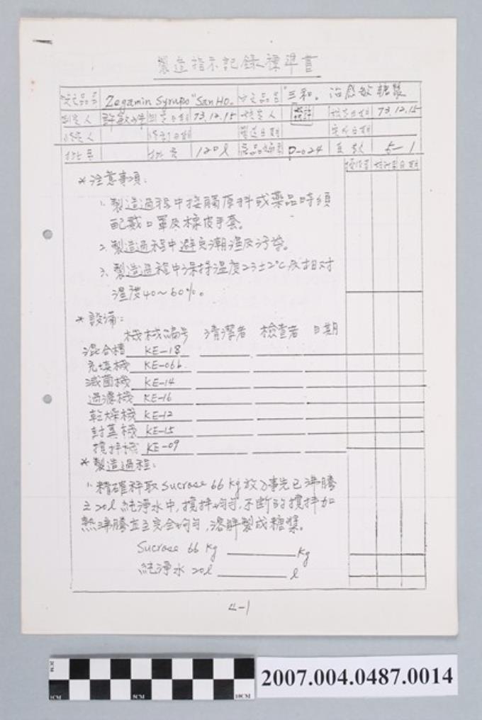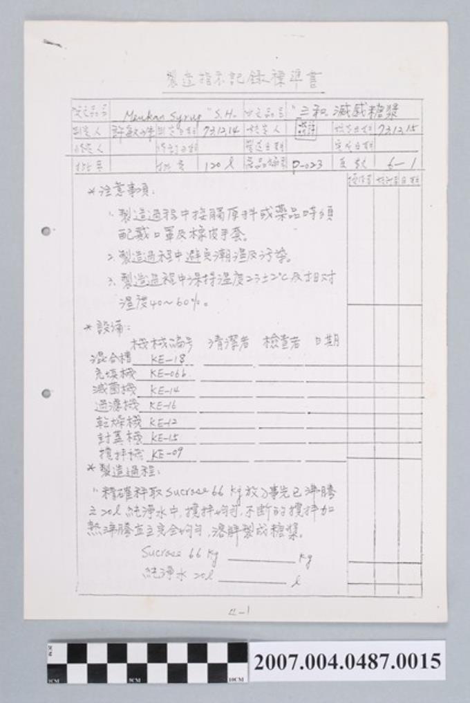 三和滅感糖漿製造指示記錄標準書