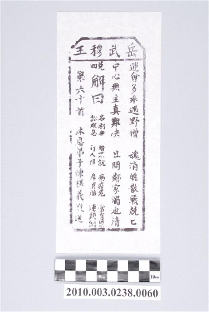 宜蘭碧霞宮岳武穆王籤詩木刻拓本第六十首