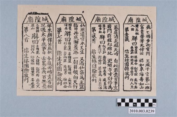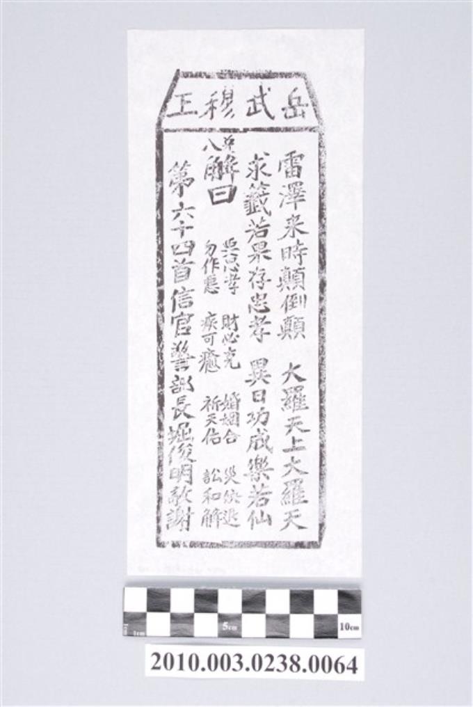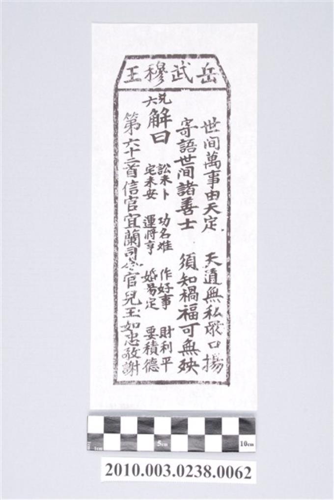 宜蘭碧霞宮岳武穆王籤詩木刻拓本第六十四首