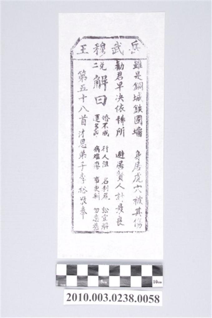 宜蘭碧霞宮岳武穆王籤詩木刻拓本第五十八首