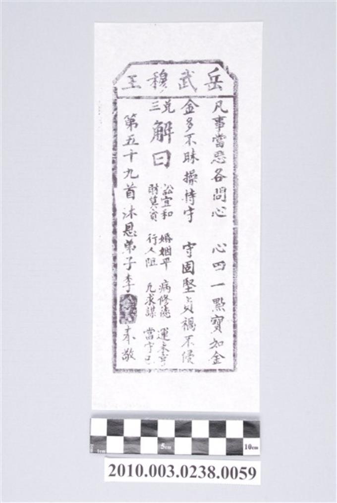 宜蘭碧霞宮岳武穆王籤詩木刻拓本第五十九首