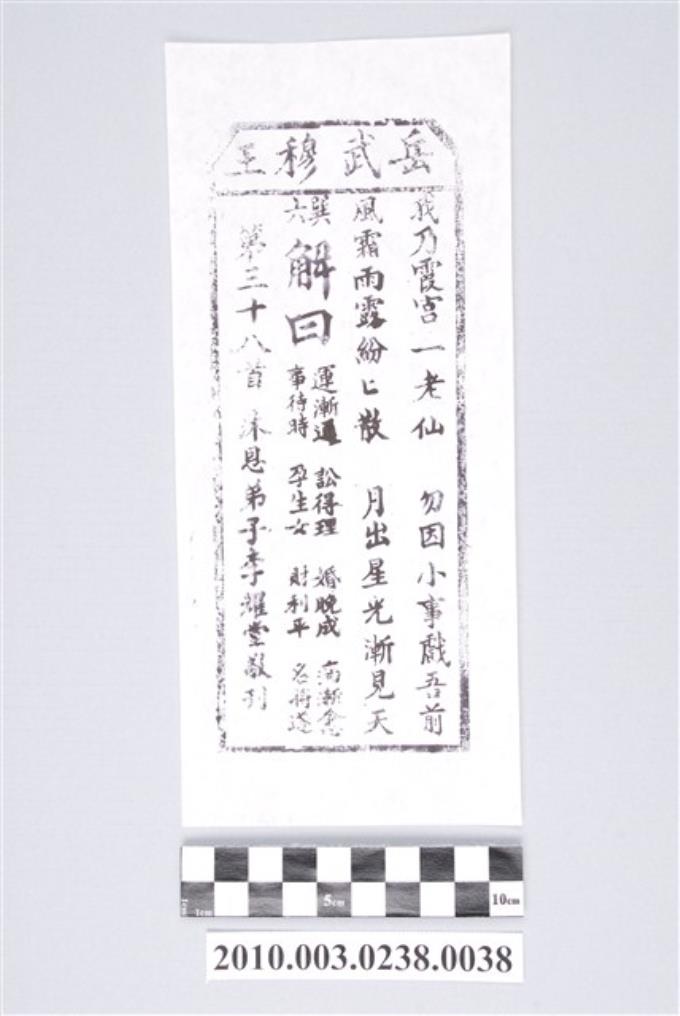 宜蘭碧霞宮岳武穆王籤詩木刻拓本第三十八首