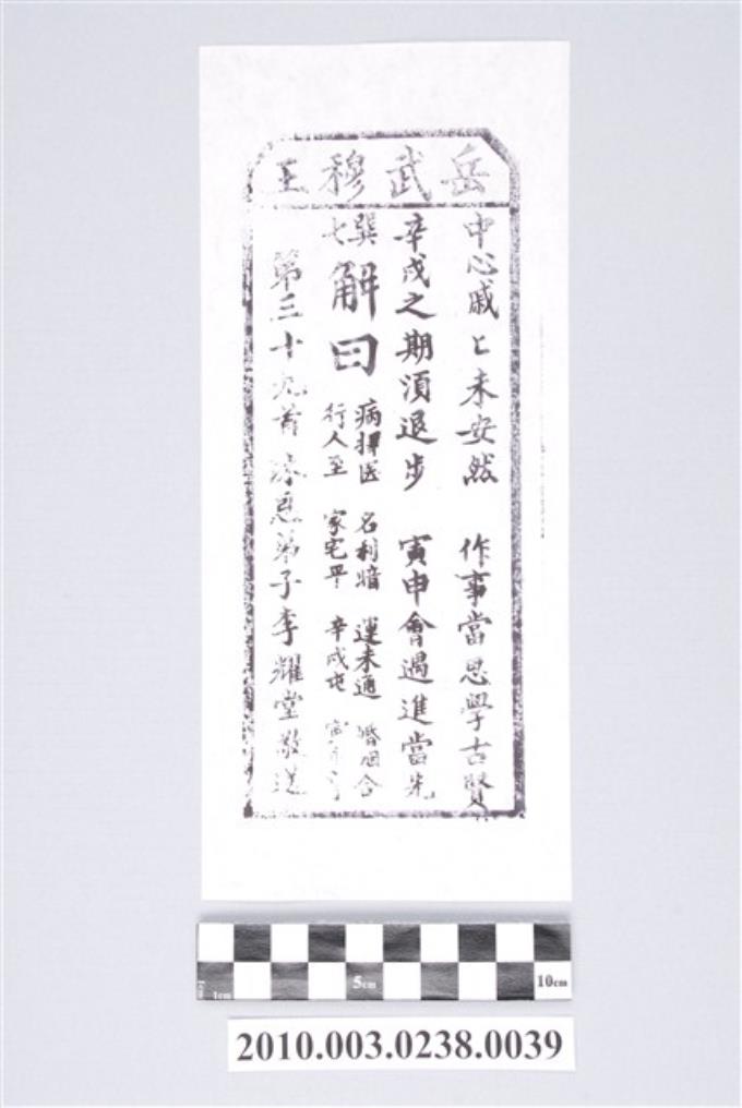 宜蘭碧霞宮岳武穆王籤詩木刻拓本第三十九首