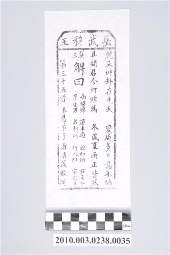 宜蘭碧霞宮岳武穆王籤詩木刻拓本第三十五首