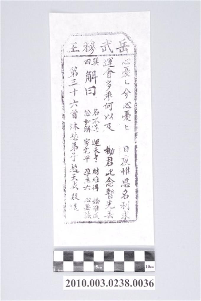 宜蘭碧霞宮岳武穆王籤詩木刻拓本第三十六首