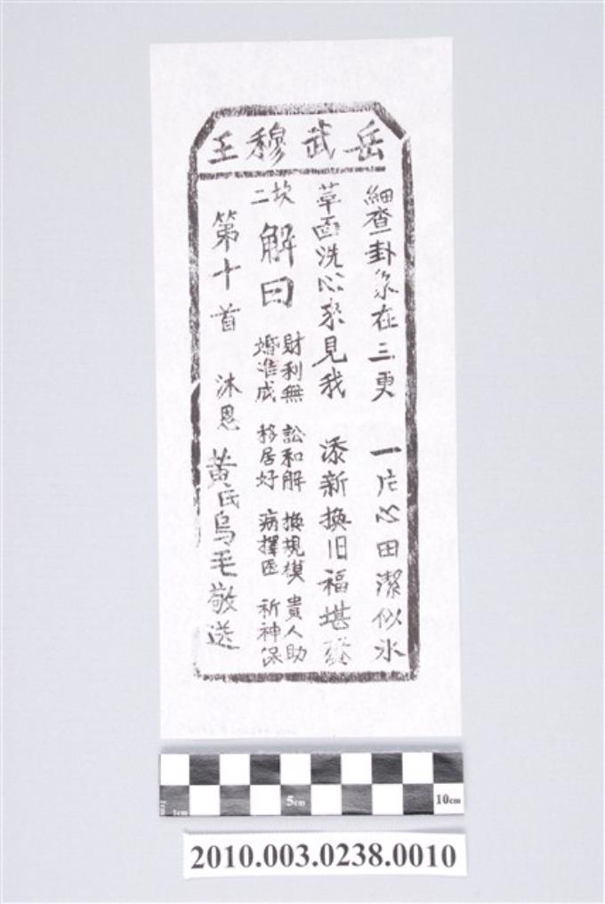 宜蘭碧霞宮岳武穆王籤詩木刻拓本第十首