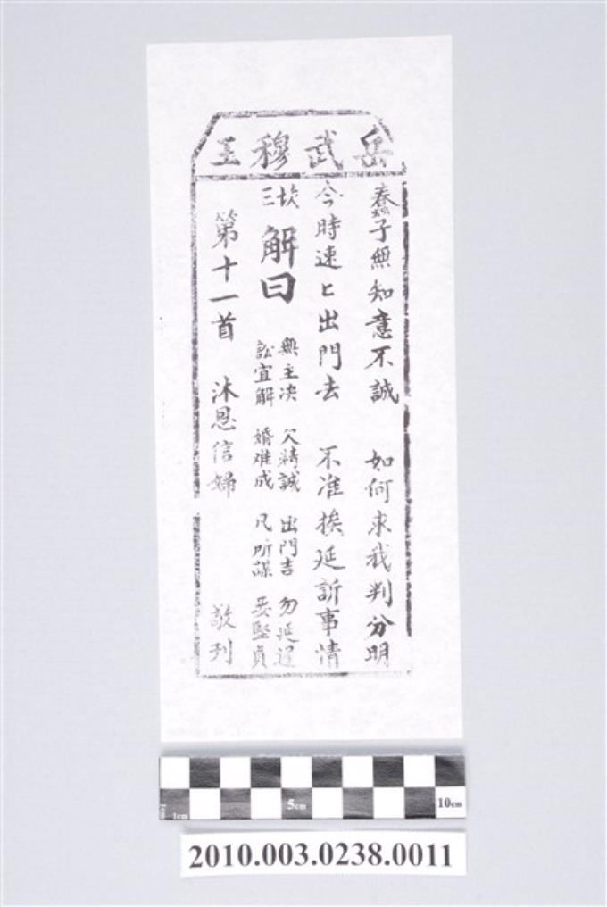 宜蘭碧霞宮岳武穆王籤詩木刻拓本第十一首