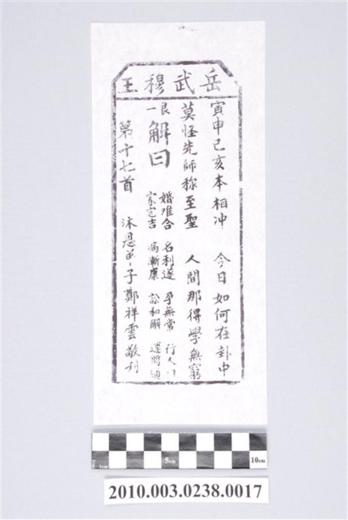 宜蘭碧霞宮岳武穆王籤詩木刻拓本第十七首