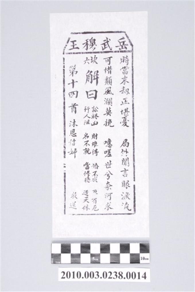 宜蘭碧霞宮岳武穆王籤詩木刻拓本第十四首
