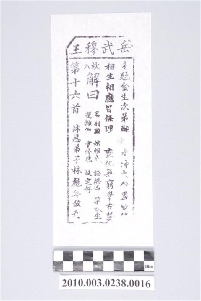 宜蘭碧霞宮岳武穆王籤詩木刻拓本第十六首