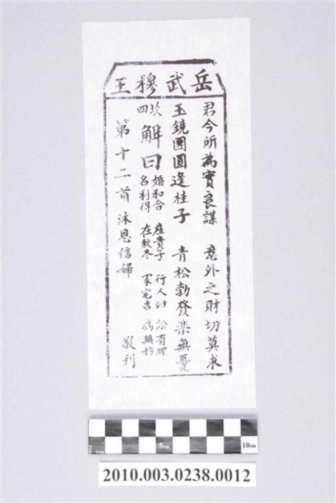 宜蘭碧霞宮岳武穆王籤詩木刻拓本第十二首