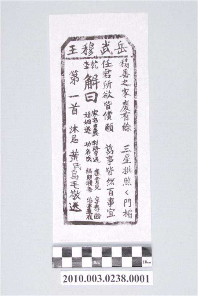 宜蘭碧霞宮岳武穆王籤詩木刻拓本第一首