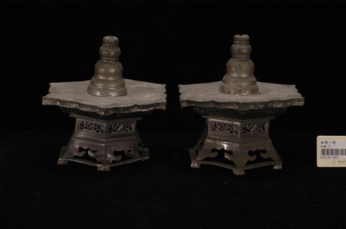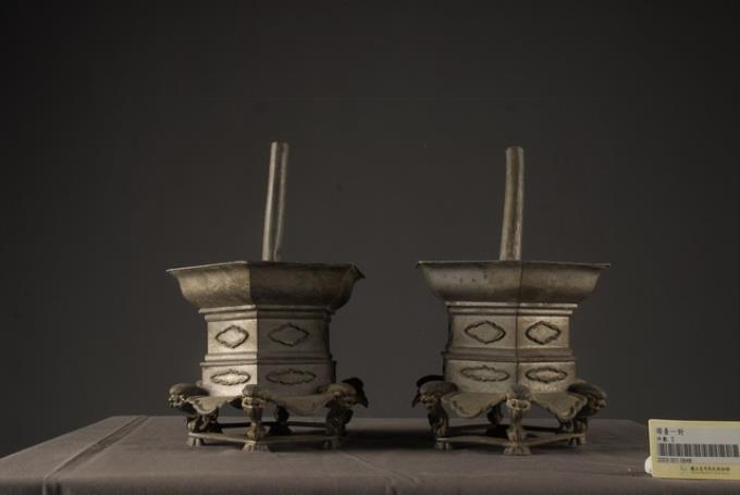 錫製六角虎首足燭臺組