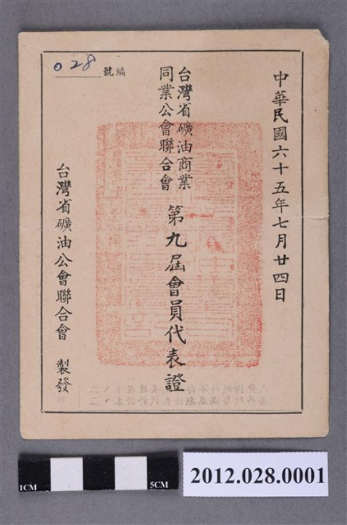 臺灣省礦油商業同業公會聯合會第九屆會員代表證