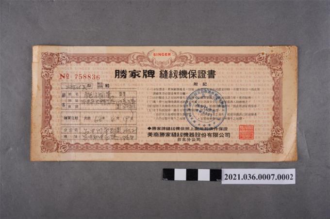 勝家牌縫紉機保證書