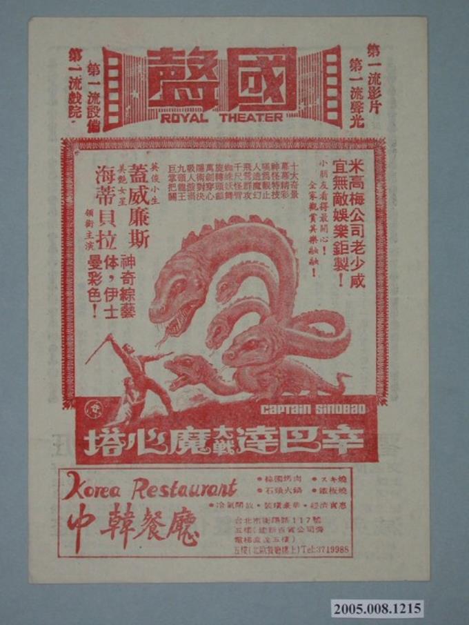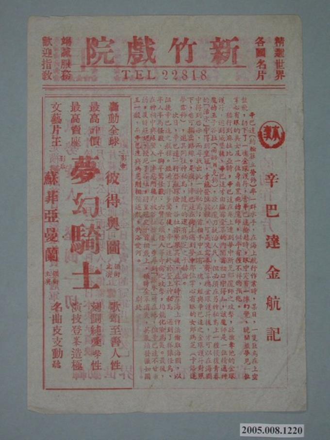 新竹戲院發行《辛巴達金航記》電影本事