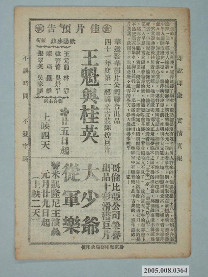 豐中戲院發行《戰地姻緣》電影本事