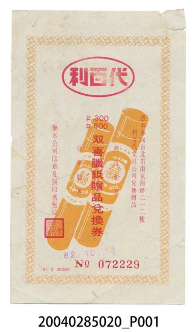 利百代雙喜蠟紙贈品兌換券