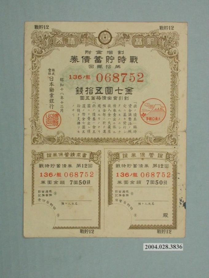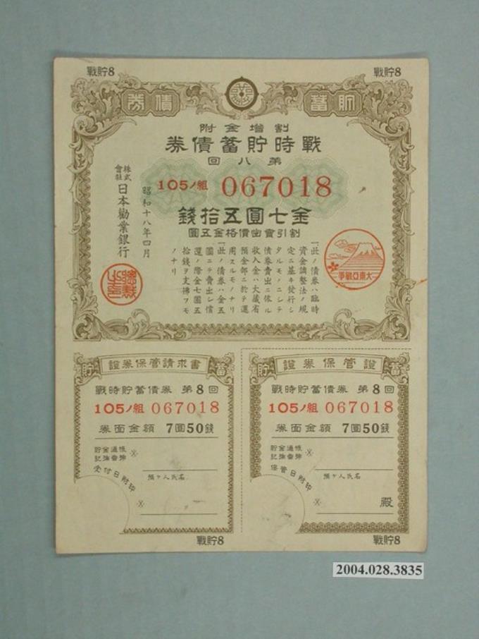 株式會社日本勸業銀行發行溢價金附戰時貯蓄債券