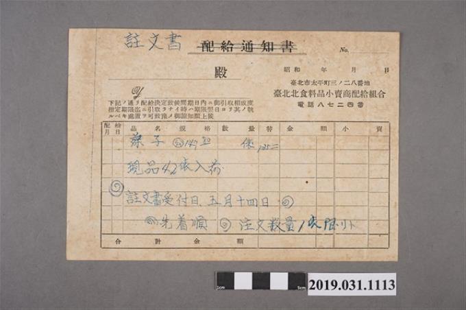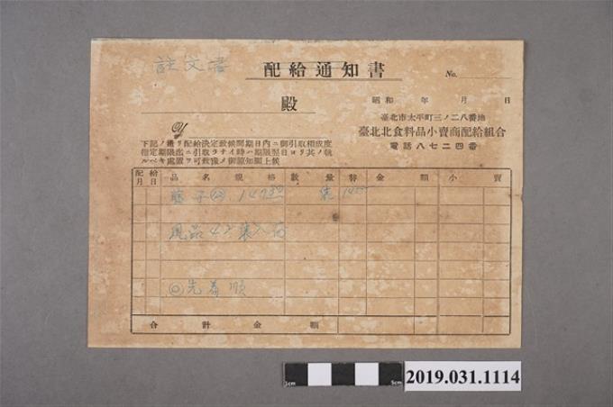 臺北北食料品小賣商配給組合配給通知書與訂購單與調查座談等通知書