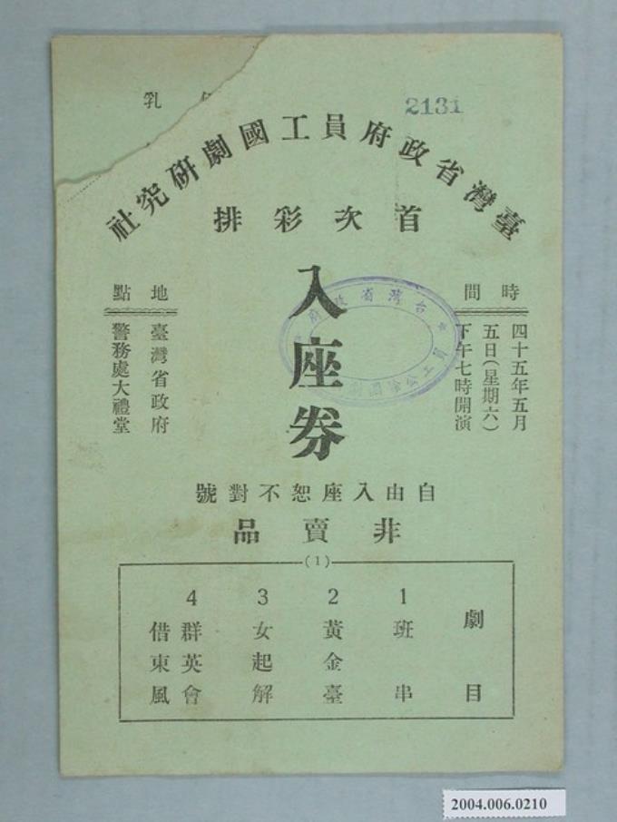 臺灣省政府員工國劇研究社首次彩排入座券編號2131
