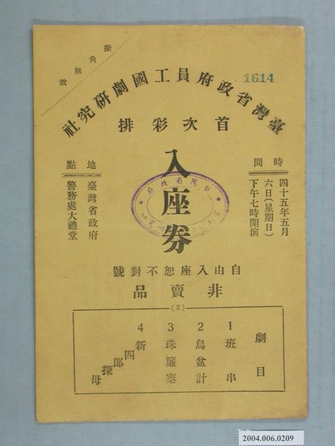 臺灣省政府員工國劇研究社首次彩排入座券編號1614