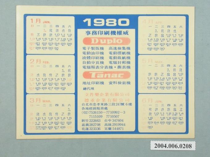 立普樂企業有限公司與德重企業有限公司印刷1980年年曆禮品