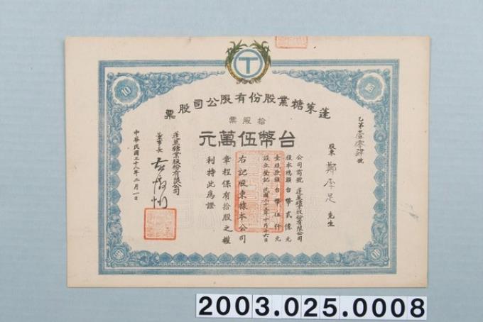 鄭李足蓬萊糖業股份有限公司股票十股五萬元