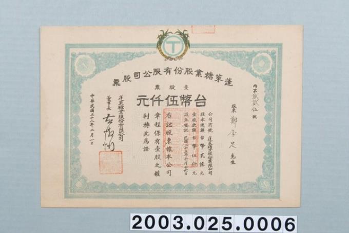 鄭李足蓬萊糖業股份有限公司股票一股五千元