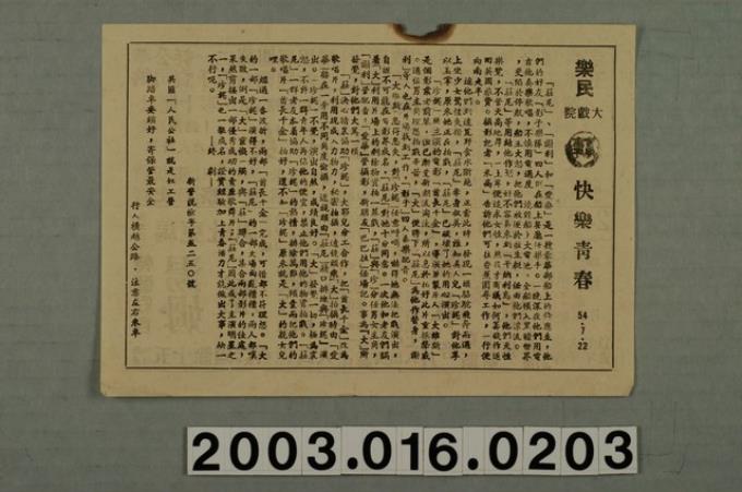 樂民大戲院發行《快樂青春》電影本事