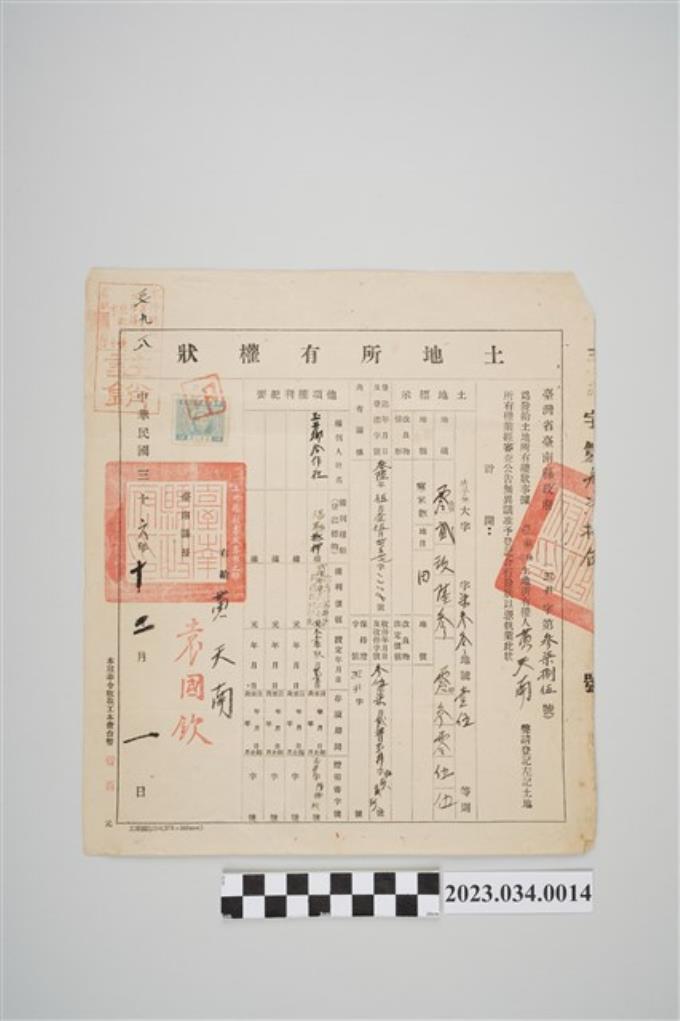 民國36年黃天南臺南縣芒仔芒土地所有權狀