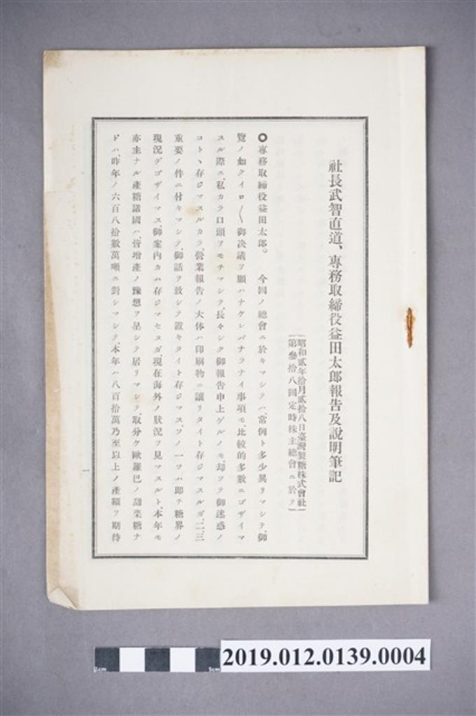 臺灣製糖株式會社第38回例行股東會議 總經理、常務董事益田太郎報告及說明筆記