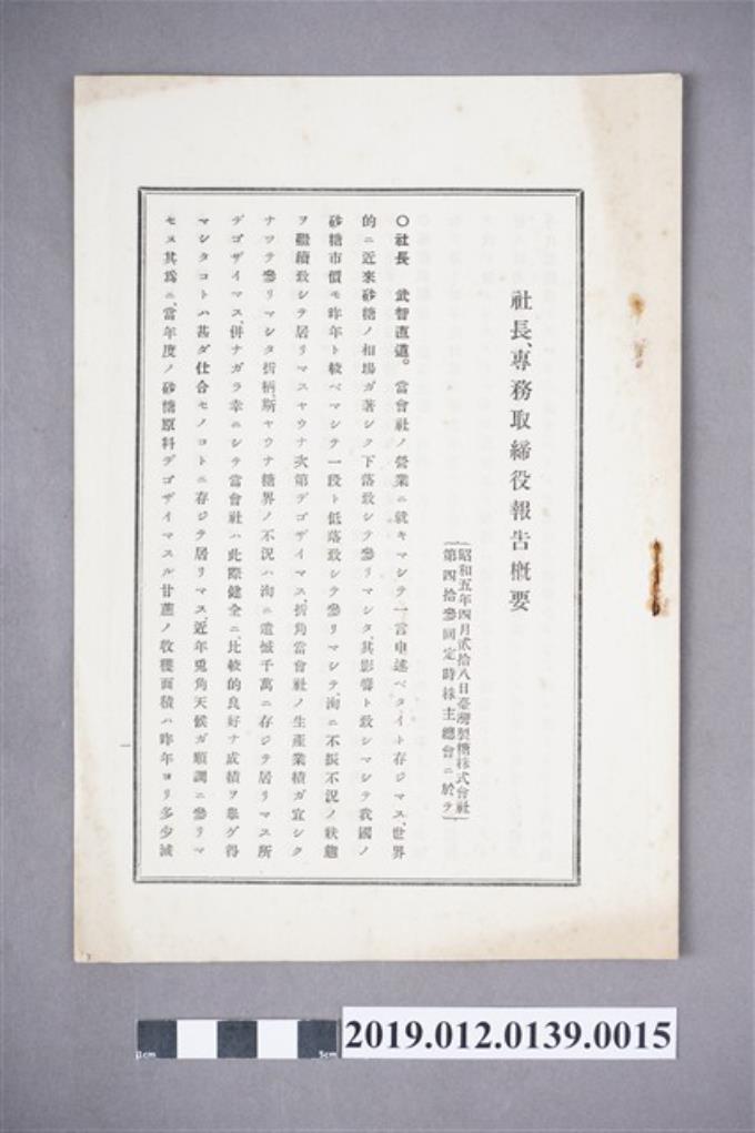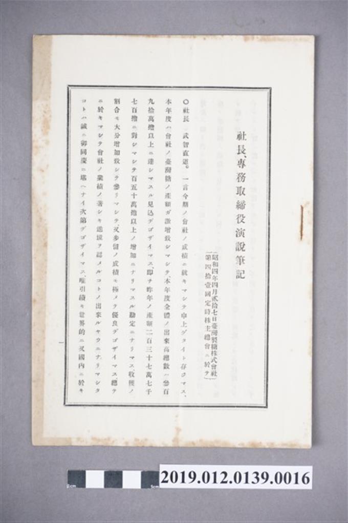 臺灣製糖株式會社第41回例行股東會議總經理與常務董事演說筆記