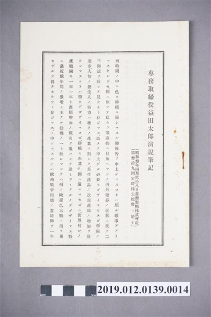 臺灣製糖株式會社第39回例行股東會議常務董事益田太郎演說筆記