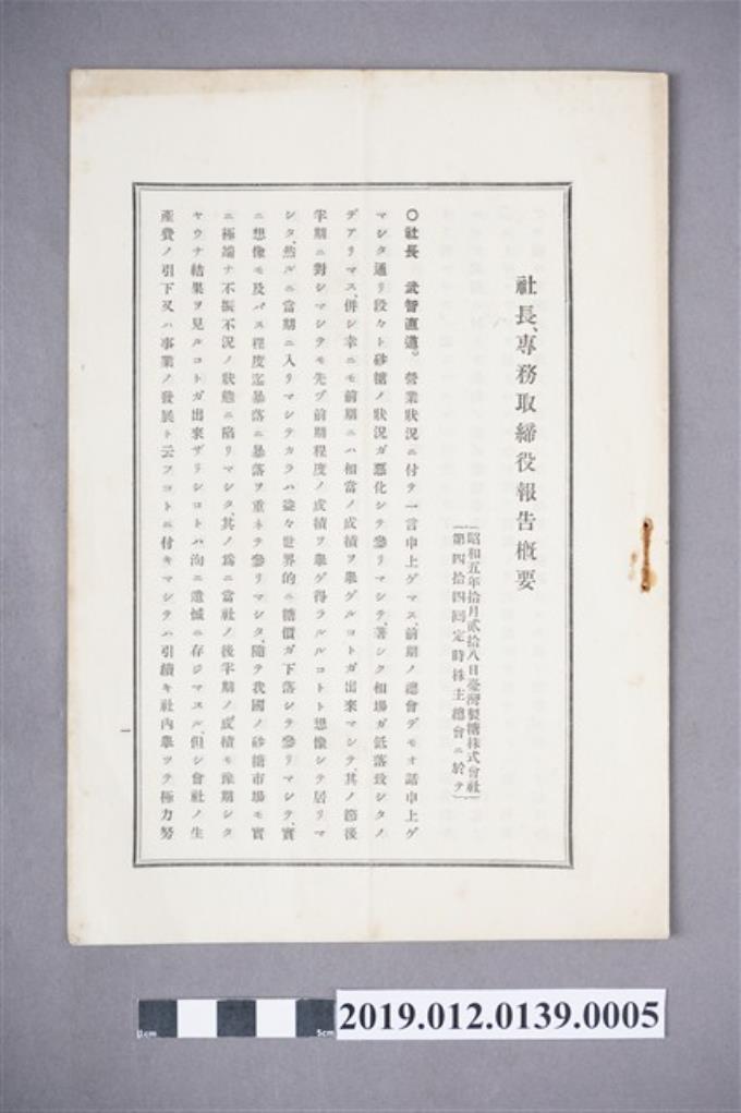 臺灣製糖株式會社第44回例行股東會議總經理與常務董事報告概要