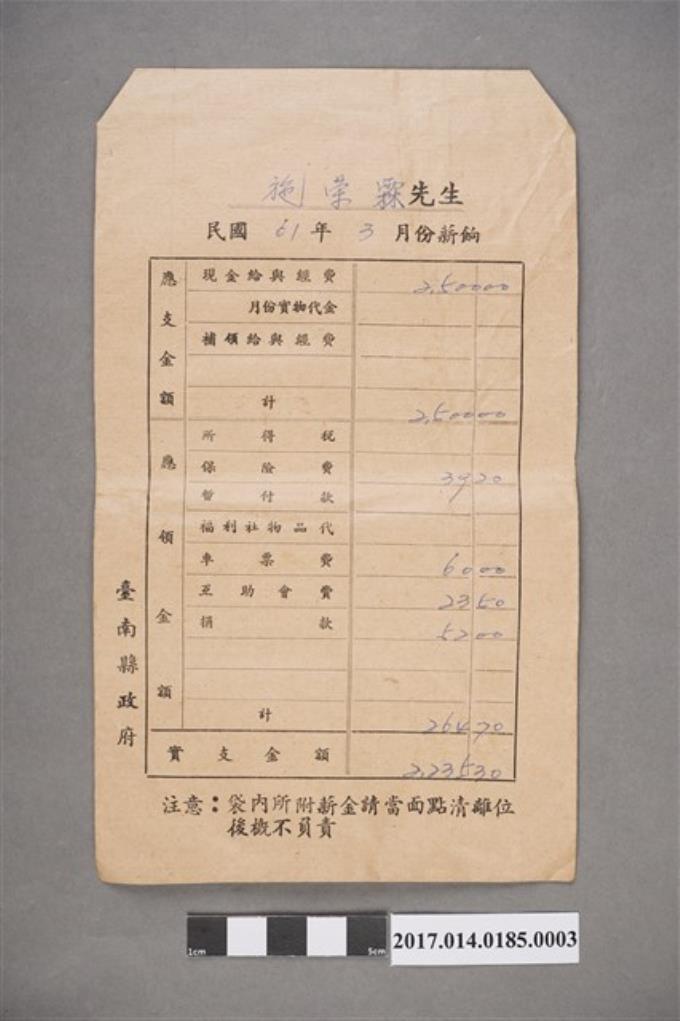 施榮霖民國61年3月薪資袋