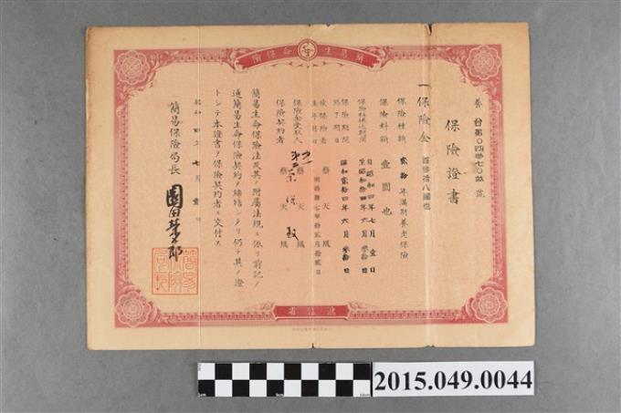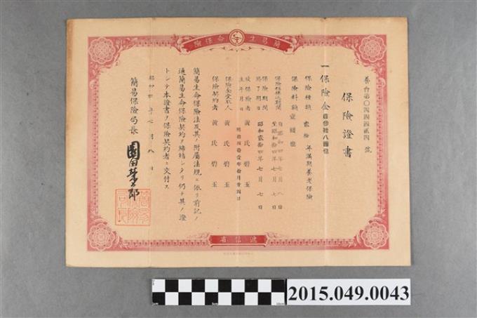 簡易保險局長給黃氏碧玉簡易生命保險證書