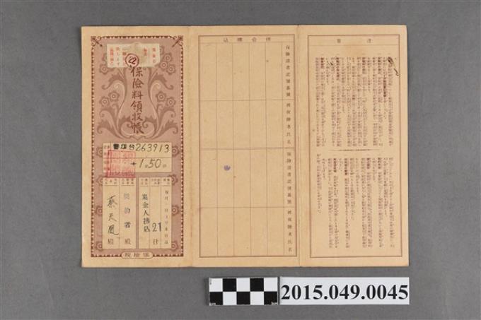 保險院簡易保險局發給蔡天鳳保險費領收簿