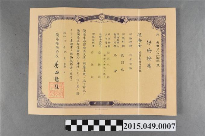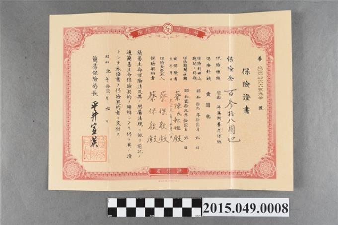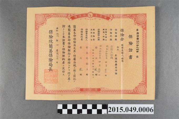 遞信省簡易保險局給蔡保教簡易生命保險證書
