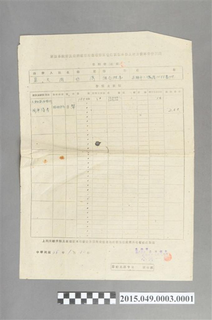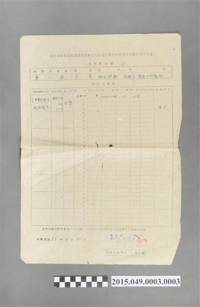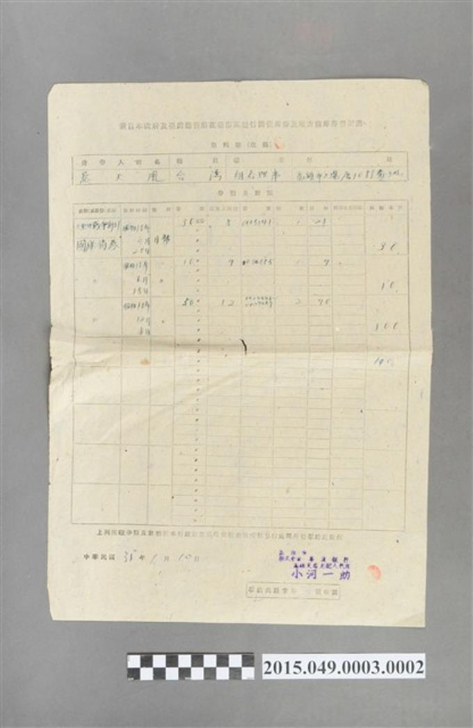 高雄市株式會社臺灣銀行高雄支店發給蔡天凰前日本政府及臺灣總督府在臺澎區發行國債庫券及地方債庫券登記表收據