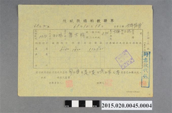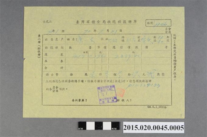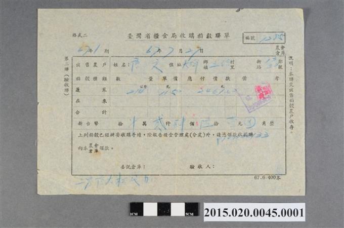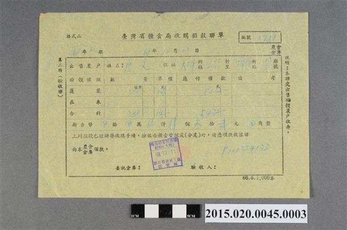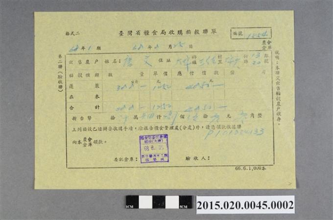 臺灣省糧食局隨賦徵購稻穀聯單68年2期