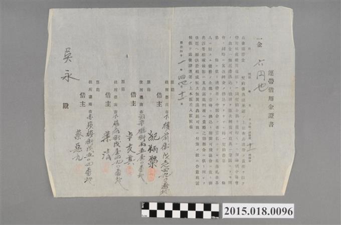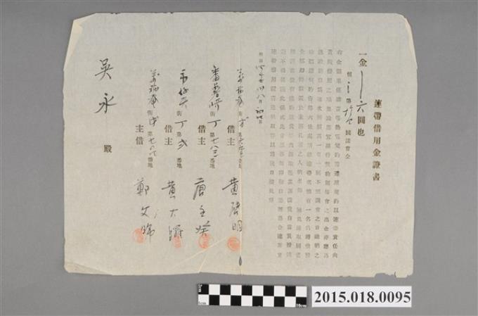 明治40年8月黃啟明等人給吳永之連帶借用金證書