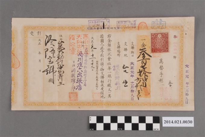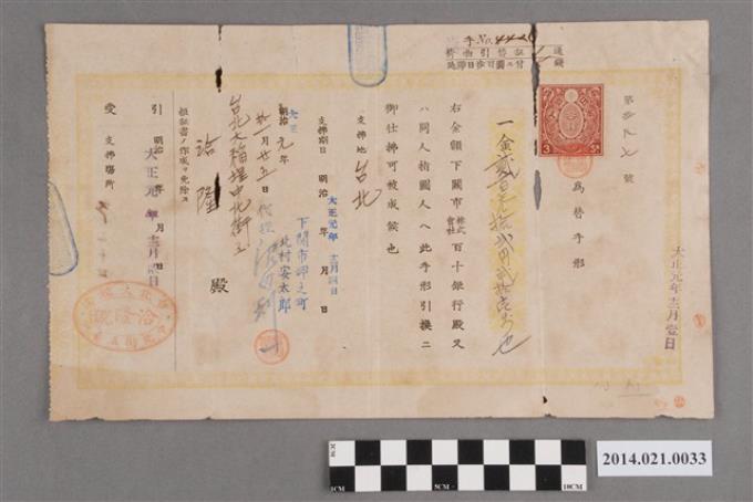 鳥井清右衛門開給洽隆大寶號周雨霖313.65圓匯款票據