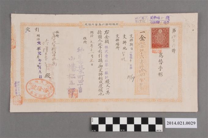 高山七吉郎開給洽隆寶號213圓匯款票據