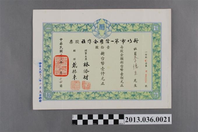 新竹市第一信用合作社10股面額1000元股票(民66.2.14)